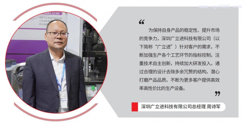 近年來,廣立進將在研發上加大投入,豐富基礎產品結構,真正踐行高精密立式電動注塑機替代進口的目標,而非那些同質化、高能耗的普通機型。無論在精度、效率還是節能減排上,廣立進都要快人一步。更重要的是,廣立進致力于提供系統少人或無人化的解決方案,圍繞提質、降本、增效三個核心重點,為客戶更好地服務,提高綜合競爭力,推動企業更快更好地發展。