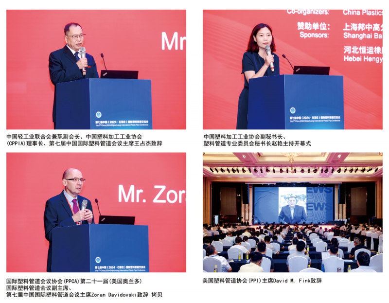 中國輕工業聯合會兼職副會長、中國塑料加工工業協會(CPPIA)理事長、第七屆中國國際塑料管道會議主席王占杰,國際塑料管道會議協會(PPCA)第二十一屆(美國奧蘭多)國際塑料管道會議副主席、第七屆中國國際塑料管道會議主席Zoran Davidovski,美國塑料管道協會(PPI)主席David M. Fink在開幕式上致辭。中國塑料加工工業協會副秘書長、塑料管道專業委員會秘書長趙艷主持會議開幕式。