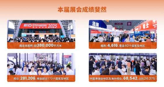 [導讀] 為期四天的“CHINAPLAS 2025 國際橡塑展”,于4月18日在深圳國際會展中心(寶安)圓滿落幕。這場全球橡塑行業的頂級盛會,以超38萬平方米的展示規模、4,616家參展企業、281,206名專業觀眾的亮眼數據,彰顯了其作為全球領先橡塑展的非凡影響力和強勁號召力。