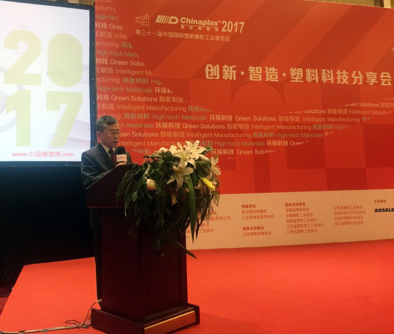 廣東省塑料工業協會會長符岸先生發表致辭:2017年國際橡塑展的面積將超過25萬平方米,預計來自160個國家和地區的3300多家展商參展以及超14萬名觀眾參觀,展會將展出超過3800臺大型設備。