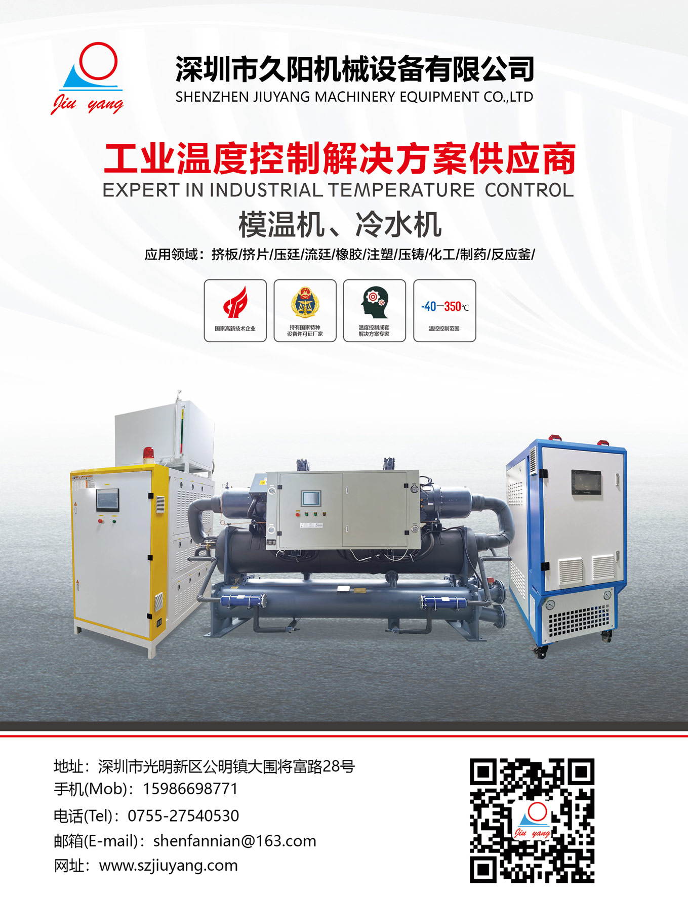 深圳市久陽機械設備有限公司位于廣東省深圳市光明區,久陽工程師及科研人員不斷研究、設計推陳出新后,形成了以模溫機、壓鑄模溫機、水溫機、注塑水溫機、油溫機、模具油溫機、油加熱器、防爆油加熱器、冷水機、工業冷水機、螺桿冷水機、風冷式冷水機、冷熱一體機、導熱油爐、電加熱導熱油爐為核心的設備生產體系。 久陽設備主要用于復合材料成型、新能源電池、鋰電池隔膜、汽車內飾配件、鎂鋁合金壓鑄、化工反應釜、食品制藥行業、橡膠和塑料制品、紡織印染、造紙印刷、烘箱烘房等行業領域。