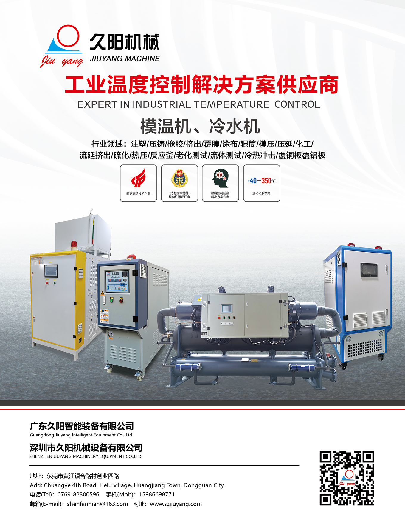 深圳市久陽機械設備有限公司位于廣東省深圳市光明區,久陽工程師及科研人員不斷研究、設計推陳出新后,形成了以模溫機、壓鑄模溫機、水溫機、注塑水溫機、油溫機、模具油溫機、油加熱器、防爆油加熱器、冷水機、工業冷水機、螺桿冷水機、風冷式冷水機、冷熱一體機、導熱油爐、電加熱導熱油爐為核心的設備生產體系。 久陽設備主要用于復合材料成型、新能源電池、鋰電池隔膜、汽車內飾配件、鎂鋁合金壓鑄、化工反應釜、食品制藥行業、橡膠和塑料制品、紡織印染、造紙印刷、烘箱烘房等行業領域。