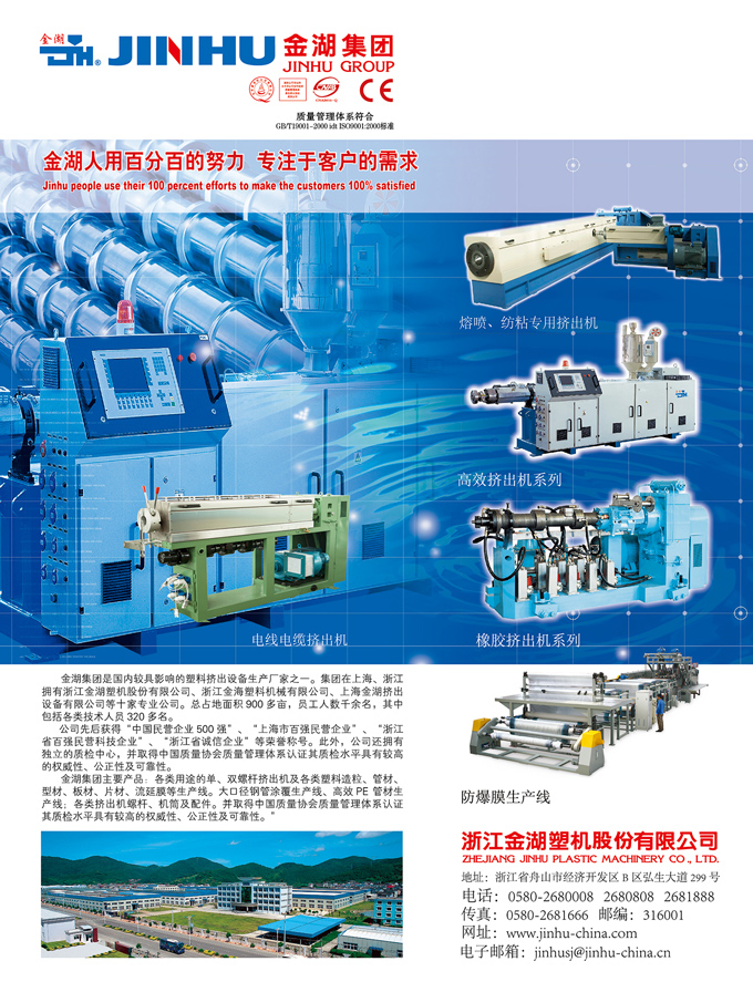金湖集團主要產品:各類用途的單、雙螺桿擠出機及各類塑料造粒、管材、型材、板材、片材、流延膜等生產線。大口徑鋼管涂覆生產線、高效PE管材生產線;各類擠出機螺桿、機筒及配件。并取得中國質量協會質量管理體系認證其其質檢水平具有較高的權威性、公正性及可靠性。