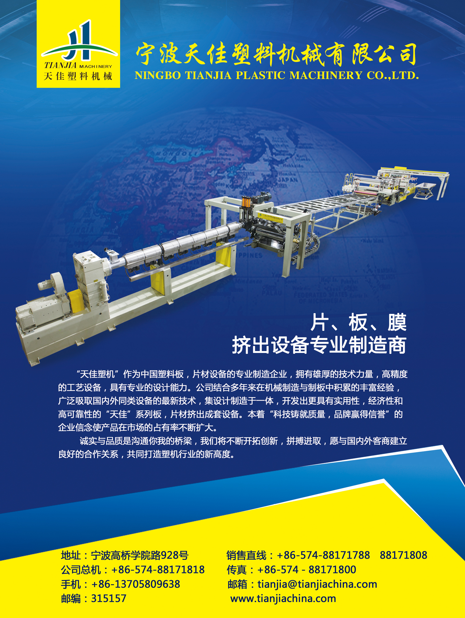 “天佳塑機”作為中國塑料板、片材設備的專業制造企業,擁有雄厚的技術力量,先進的工藝設備,具有領先的設計能力。公司結合多年來在機械制造與制板中積累的豐富經驗,廣泛吸取國內外同類設備的最新技術,集設計制造于一體,開發出更具實用性、經濟性和高可靠性的“天佳”系列板、片材擠出成套設備。本著“科技鑄就質量,品牌贏得信譽”的企業理念使產品在市場的占有率不斷擴大。 公司坐落在浙江東部沿海商都寧波,北鄰上海,距杭甬高速,機場出口6公里,距寧波民航機場僅8公里,交通十分便捷。