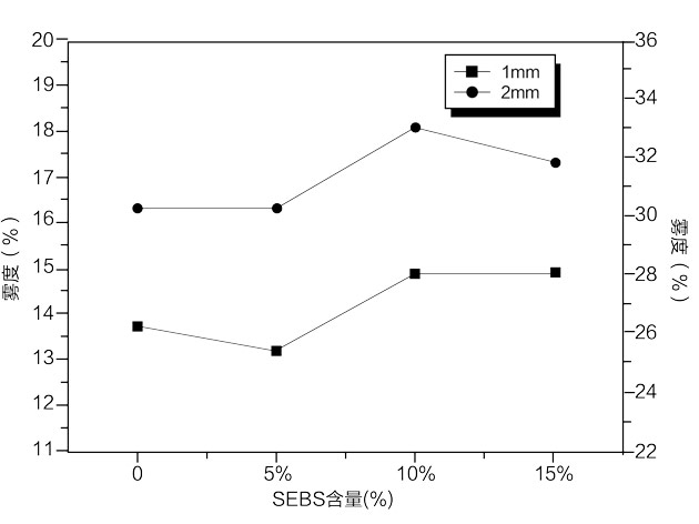 采用氫化聚苯乙烯-丁二烯-聚苯乙烯嵌段共聚物(SEBS)改性抗沖透明聚丙烯(PP),經雙螺桿熔融共混制備得到透明PP/SEBS共混物,研究了SEBS的添加量對抗沖透明聚丙烯力學性能和霧度的影響。