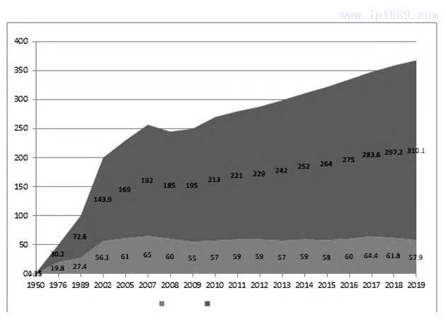 圖 1 1950—2019 年全球塑料產量變化情況圖