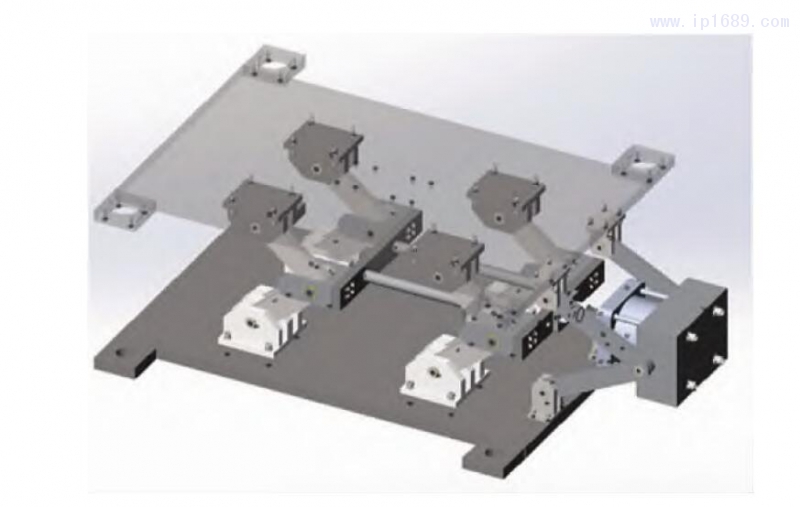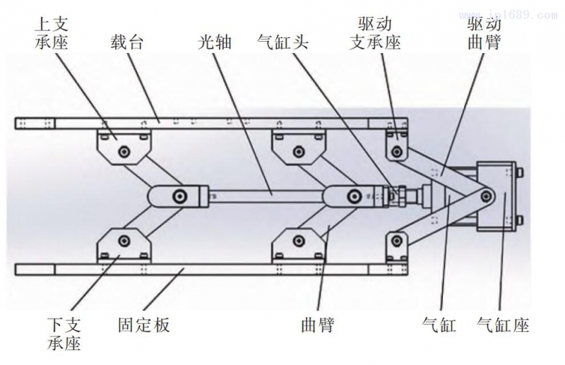 由氣缸驅動成型機構進行曲臂的張合,曲臂運動從而帶動模具載臺的上下運動,實現成型過程中的開模與合模過程 。曲臂式成型機構主要由上支承座、載臺、光軸、下支承座、固定板、曲臂塊、驅動支承座、驅動曲臂和氣缸座等組成[7-8]。圖1為結構示意圖,圖2為三維結構圖。