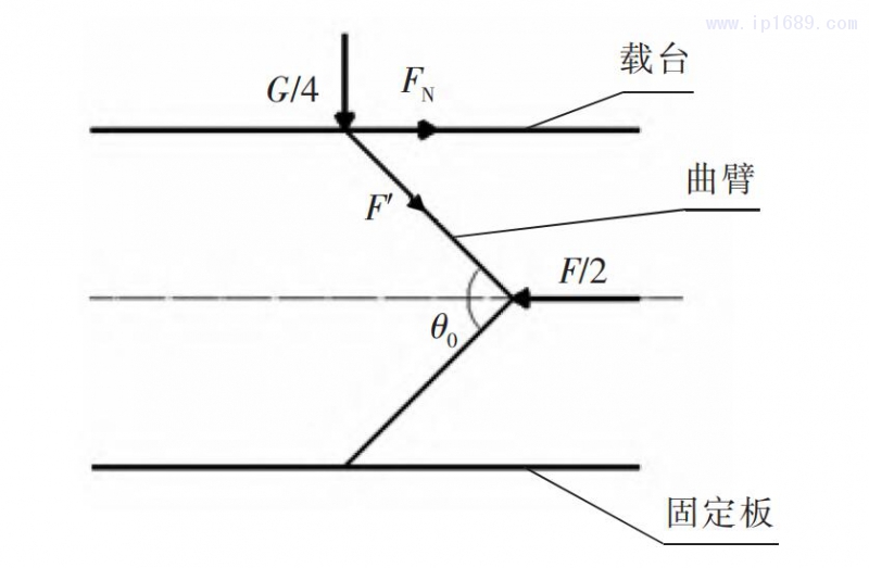 根據設計要求與圖示得到各個參數關系式 ,其中:G為載臺 、模具機構的重力之和;F為氣缸輸出力;F′為曲臂桿所受作用力。