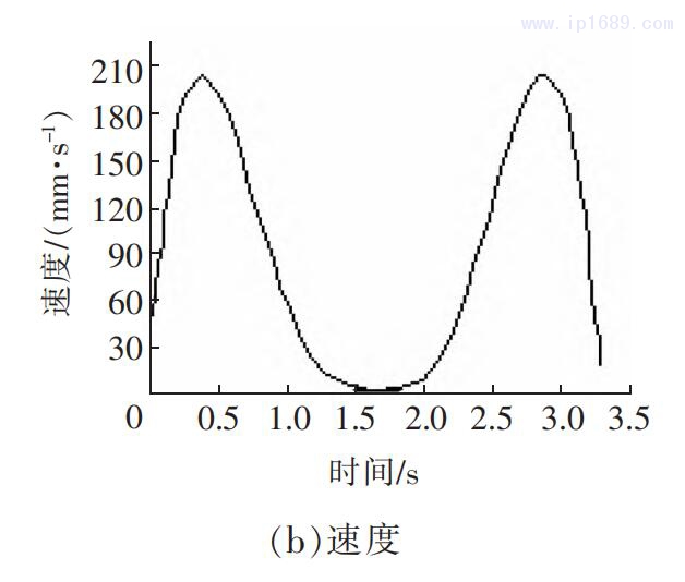 由圖 7(a)可以看出,上支承座最大位移變化為148.4 mm,接近開合尺寸的一 半 。從圖 8(b)可以看出 ,曲臂在運動過程中會發生速度突變 ,具有較大慣性 。與閉模過程相比 ,曲臂在開模的過程中,由于重力的作用其慣性更大 。針對這種情況 ,在實際使用中,可以適當增加成型結構的工作循環時間,即通過使用泄氣閥適當減少氣缸力的輸出,輔助開合模過程 ,以減小機構慣性力 。如果從幾何參數方面進行優化改進 ,相應的制造成本會增加 ,因此,適當減小氣缸壓力是較好的改進方法。模擬實驗還發現,曲臂與氣缸的夾角在 0~1.5 s 內從141.05°變成 90.24°, 符合設計要求。