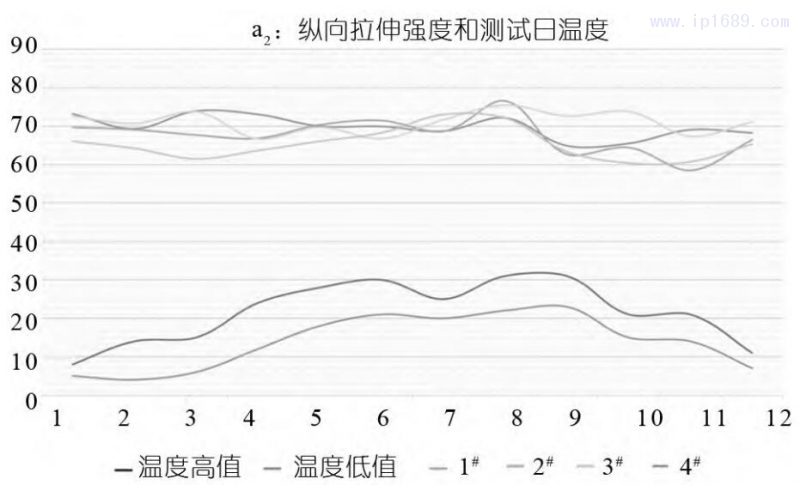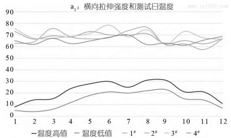 圖1是使用四種PET樣條測得的橫向拉伸強度(MPa)值和測試當日的溫度區間值繪制的曲線圖。四種樣條的橫向拉伸強度區間在 57.5~78.5MPa,符合大于50 MPa的拉伸強度要求。