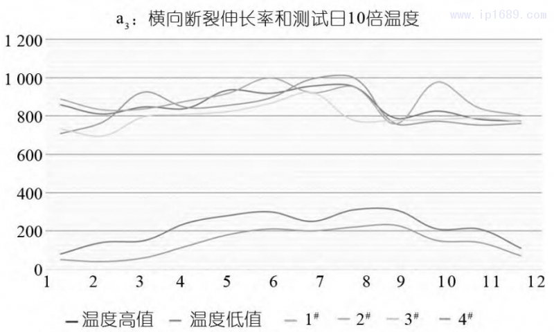 1# 樣品的縱向斷裂伸長率波動區間較平穩 ;2#、 4 # 樣品的縱向斷裂伸長率有隨溫度波動而變化的趨勢;3# 樣品的縱向斷裂伸長率在試驗后期與溫度有反向波動的情況,且 3# 樣品縱向斷裂伸長率的平均數據最佳。