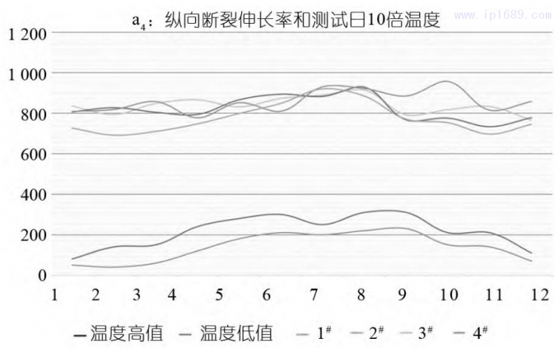 圖 3 是使用四種PET樣條測得的橫向斷裂伸長率(%)值和測試當日的溫度區間值繪制的曲線圖。因斷裂伸長率值數據較大,為在同 一曲線圖中體現出溫度波動,特把溫度區間值放大了10倍,以便觀察。測得的四種樣條橫向斷裂伸長率區間在696%~1 001%,符合大于 500%的斷裂伸長率要求。
