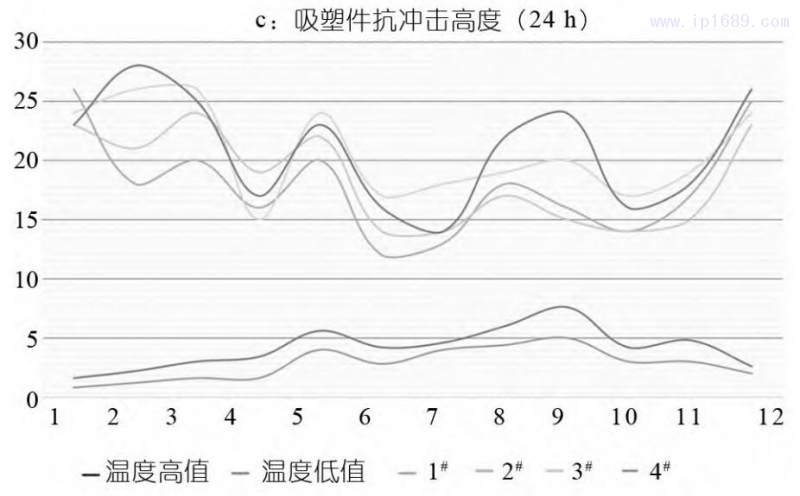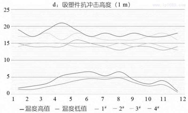 從曲線圖來看,環境溫度的波動對本批次的庫存吸塑件樣品的抗沖擊高度沒有明顯影響。但與按月制作的吸塑件抗沖擊高度比較,庫存吸塑件的抗沖擊高度有明顯降低。