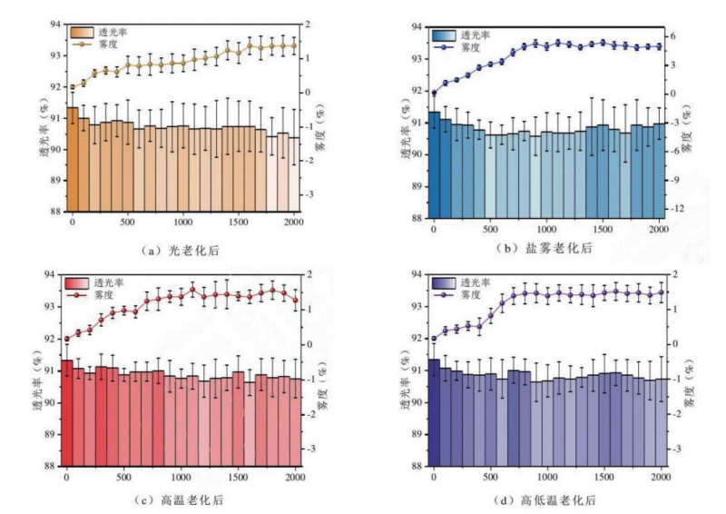 SWCNTs透明導電薄膜的透光率和霧度隨老化時間的變化情況如圖10所示??梢?,在光、高溫、高低溫老化過程中,SWCNTs透明導電薄膜的透光率呈現出明顯的下降趨勢,鹽霧老化過程中,薄膜的透光率先下降后上升,最終仍未達到未老化時的透光率,薄膜的霧度在2000h的光、鹽霧、高溫、高低溫老化后均有所上升。四種老化條件下,光老化對SWCNTs透明導電薄膜透光率的影響最大,2000h老化后薄膜的透光率降低至90.39%。鹽霧老化對SWCNTs透明導電薄膜的霧度產生了較大影響,2000h老化后薄膜的霧度上升至4.98%。