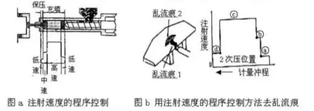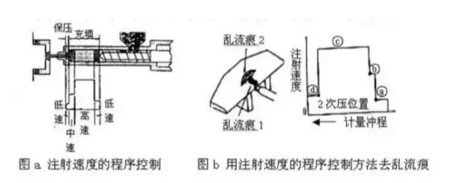 如圖b,就采用了在注射的初期使用低速,模腔充填時使用高速,充填接近終了時再使用低速注射的方法。通過注射速度的控制和調整,可以防止和改善制品外觀如毛邊、噴射痕、銀條或焦痕等各種不良現象。