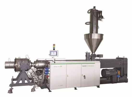 這臺leanEX 2-93R-28-CL平行雙螺桿擠出機,是最高產量達580公斤/小時的高產量系列,也是管材擠出中成功的交鑰匙leanEX系列的延伸。