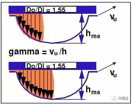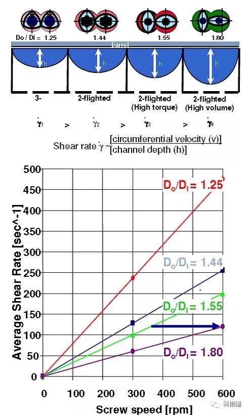 此項技術成功的關鍵在于提高螺桿轉速的同時,提高能量(扭矩)傳輸能力。在高速運轉下的一個系統在某些點會產生足夠額外的能量,導致所加工物料的降解。圖1闡明了此點。它表明對于任何Do/Di(外徑和內徑之比)的螺桿,平均剪切率(能量輸入)會隨著螺桿轉速的提高而線性提高。所以所加工物料的溫度也會相應的提高。但是,由于雙螺桿擠出機首先是運行在一個饑餓吃料模式之下,更高的能量傳輸能力可使物料在擠出機中能有更高的填充度,所以在同樣轉速下有更高的產能。(例如圖1比較了低填充度高點和高填充度低點的情況。)反過來,填充度的提高對降低熔溫也有積極效果。