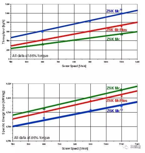 在圖3的上部,顯示了3代ZSK的產能和轉速關系。更高比扭矩(ZSK Mc 18)有最高的產能。而且,如圖的下部顯示,它同樣有著最低的比能耗。從兩個結果(更高的產能和更低的SEI)的結合來看,這個數據顯示了使用最高比扭矩的設備,有著雙倍的經濟效益。第一,從這幾代機型來看,因為更低的SEI(比能耗 – 同樣也寫作Sme:比機械能),更高比扭矩PVF系統有更高的產能,此更高的產能高于比扭矩的提高而導致的線性提高。(在這個具體例子上,PVF只提高了略高于50%,但產能提升率則在70-80%。)產能提升的一般指導在于:現在的產能 = 舊的產能 × (PVF高扭矩/PVF低扭矩) × (SEI低扭矩/SEI高扭矩)。第二,這里還存在一個額外的每公斤比能耗的節約。