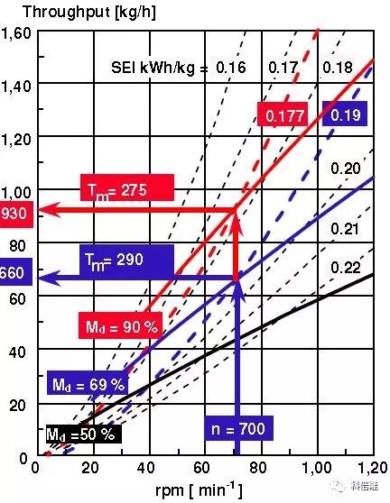 這種關系[8]的一個例子可在圖4中發現。圖4中顯示3種比扭矩機型產能對于螺桿轉速的曲線關系。SEI同樣作為參數因子。此數據來源于在ZSK 58 Mc (Do/Di = 1.55, torque= 1250 N-m/shaft, PVF = 11.3)上加工ABS 接枝共聚物(Acrylonitrile-Butadiene-Styrene)。69%和90%的2個曲線比較了在90%扭矩運行下在低扭矩機型ZSK 58 SuperCompounder (Sc) (Do/Di = 1.55, 960 Nm/ shaft, PVF 8.7)和在Mc (1250 N-m/shaft)上的情況。此2款機型有著30%的扭矩差距。對于此例,選擇了一個恒定的轉速700rpm。在69%扭矩曲線上(在960 Nm芯軸擠出機上90%扭矩運行),產能在660kg/h,SEI在0.19kw-h/kg,熔溫為290°C。提高產能到90%扭矩曲線,可發現SEI從0.19降低到0.177kw-h/kg。產能有40%的提高,到930kg/hr,不僅僅是預計的30%的提高。同時熔溫也降低了15°C到275°C。這尤其有利于熱和剪切敏感物料。它們可以運行在高產能之下,同時有著較低的熔溫。