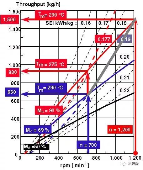 所以,如果290°C的初始溫度是安全的,那么從圖5可看出高扭矩和高轉速結合的顯著影響。轉速提升到1200rpm時,產量可達1500kg/hr,此時出口溫度為290°C,這個溫度與低扭矩操作系統相同。但產能則從原來的660kg/hr提升了150%多。