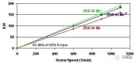 圖6:ZSK 45 Mc 18和之前幾代更大外徑的ZSK 50擠出機有效功率的比較