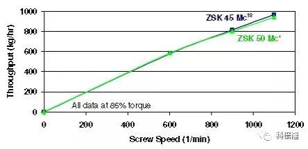 圖7:不同轉速下ZSK 45 Mc 18和更大機型ZSK 50 Mc+產能的比較(30%玻纖增強PA6)