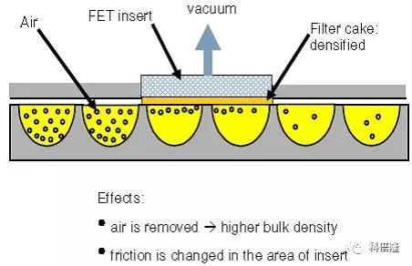 圖8描繪了FET的工作原理。通過多孔材料來施加真空,在聚合物或者填料經過FET筒壁段的嵌件時,周圍的空氣被抽走。因為空氣被抽向嵌件,連帶著粒子也向嵌件表面運動。空氣能通過孔隙,但粒子不能,于是覆蓋在多孔材料表面。這層粒子,或者稱之為濃縮聚合物粉末形成的濾餅,能增加筒壁和物料之間的摩擦系數。旋轉的螺桿不斷更新因真空而粘附在筒壁上的物料。而且,粉末的密度在通過嵌件之后也增加了。這兩種效應的共同作用,帶來了更高的輸送效率。