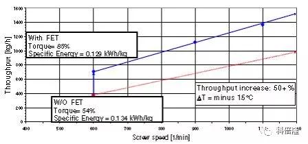 在物料能運行在高轉速下時,可以達到很高的產能。但是對絕大多數系統來說,對現有機器簡單的提升轉速不能達到期望的目的。在產能提升時,產品性能可能下降到及格線以下。但是,在高扭矩下提高轉速,聚合物加工工藝經濟能顯著提升,而不損失產品性能。另外,當處理低堆積密度原料遇到困難時,FET可以給予幫助,以充分利用雙螺桿擠出機的最大能力。(文章來源于網絡)