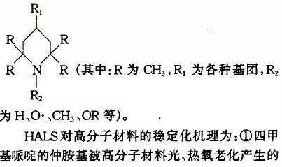 受阻胺光穩定劑(HALS)是一類具有空間位阻效應的有機胺類化合物,絕大部分品種均以2,2,6,6一四甲基一4一哌啶基為母體,其代表結構式為: