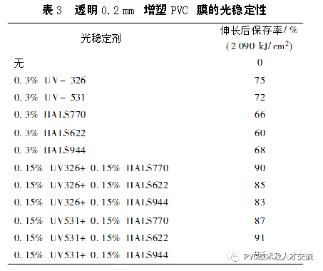 表3的數據說明,PVC透明膜中單獨使用受阻胺光穩定劑HALS的效果,與單獨使用苯并三唑UV一326或二苯甲酮Uv一531光穩定劑的效果相當。受阻胺光穩定劑HALS與苯并三唑或二苯甲酮復合使用的效果優于三類光穩定劑單獨使用的效果。