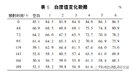 樣條經20 W 紫外線燈照射后測定其白度值,結果見表5。表5中的數據證明,受阻胺光穩定劑GW一944Z使PVC型材的抗變色能力有所提高[3]。