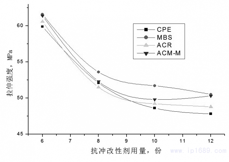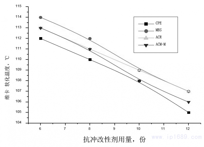 ·在CPVC管材的加工中加入CPE,其增韌效果十分明顯,添加量在8~12份之間增韌效果最好,但加入CPE會明顯降低管材的維卡軟化溫度;MBS、ABS對維卡軟化溫度影響較小,但由于它們的分子鏈中含有不飽和雙鍵,耐候性較差;抗沖型ACR是較為理想的抗沖擊改性劑,但價格較高。