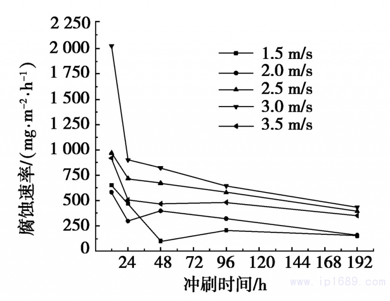 圖2、B10銅鎳合金管材隨沖刷時間變化的腐蝕速率