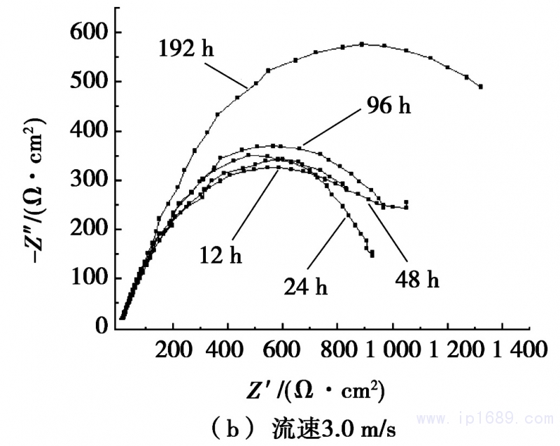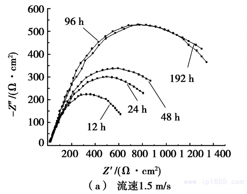 圖4為在人工海水流速為1.5m/s和3.0m/s的條件下,B10銅鎳合金管材隨著沖刷時間的延長電化學阻抗的變化,其中,橫坐標為阻抗的實部,縱坐標為-1倍的阻抗虛部。從圖4a可以看出:人工海水流速為1.5m/s時,隨著沖刷時間的延長,高頻區容抗弧的半徑增大,說明隨著沖刷時間的增加,合金表面電荷轉移電阻是增大的。沖刷96h時,容抗弧半徑突然變大,說明此時合金的表面已經形成較為完整的鈍化膜層。從圖4b可以看出:人工海水流速為3.0m/s時,沖刷192h后,容抗弧半徑急劇增大,說明合金表面的電阻變大,腐蝕速率開始下降。