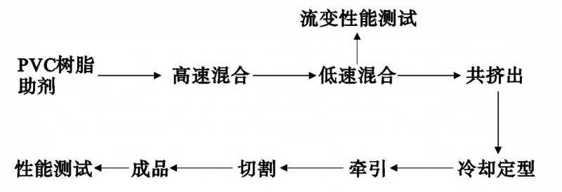 PVC一SG5、有機錫穩定劑、增韌劑、加工改性劑ACR、潤滑劑、納米碳酸鈣、炭黑、鈦白粉,均為市售。