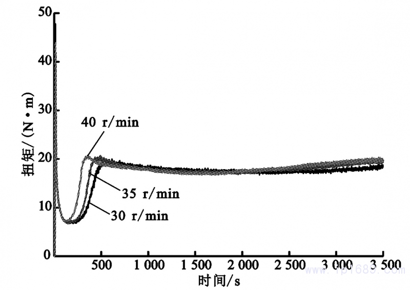 圖4為有機錫穩定劑用量為B份,轉矩流變儀溫度為185 ℃時,轉速對PVC物料流變性能的影響。由圖4可知:不同轉速下PVC物料的后期流變性能相差不大;當轉速為35 rimin時, pvc物料具有適中的塑化速率。