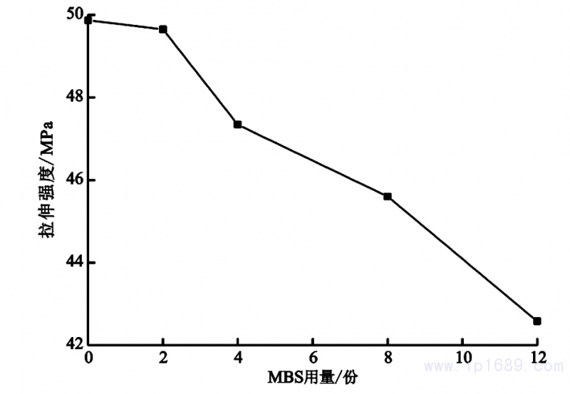 由圖5、圖7可以看出:當MBS用量為2、4 份時,PVC材料的沖擊強度變化不明顯;隨著MBS 用量的繼續增加,PVC材料的沖擊強度明顯提高;當MBS用量為12份時,PVC材料的沖擊強度是純 PVC的22倍,此時,PVC材料的斷裂伸長率也大幅提高,是純PVC的7 · 7倍,但拉伸強度略微下降(約14 · 6%)。