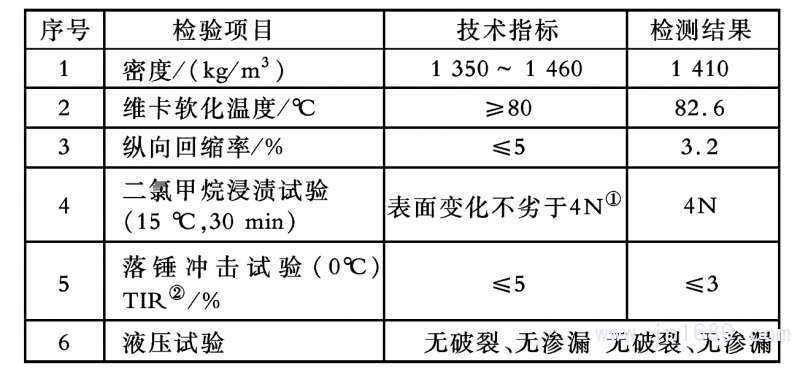 筆者研制的DN1600大口徑PVC給水管材的照片見圖9;經國家建筑材料工業建筑圍護材料及管道產品質量監督檢驗測試中心按GB/T 10002 · 1一2006《給水用硬聚氯乙烯(PVC (U)管材》檢測,其物理性能均達標,如表1所示。