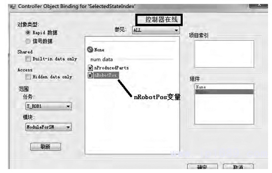 在編程的時候,在對應的位置對nRobotPos這個程序數據進行賦值,從而使界面作出相應響應。在ScreenMake界面的控件中選擇控制器在線、選擇nRobotPos變量,建立過程的界面如圖3所示。
