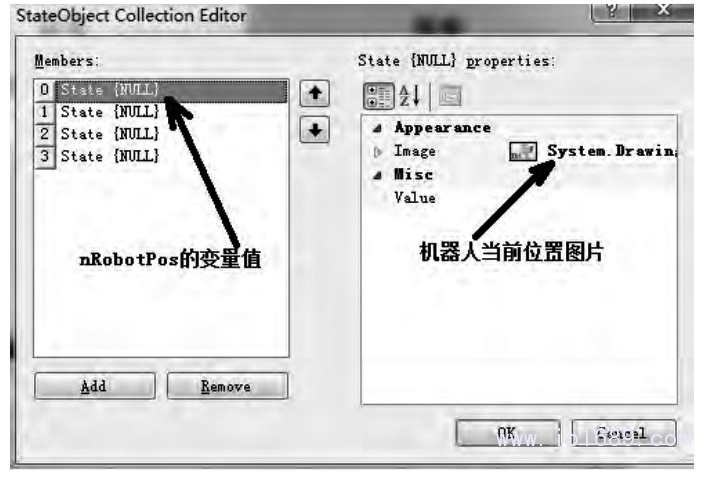 當選擇nRobotPos變量后,在建立nRobotPos的變量值后,建立nRobotPos變量值與機器人當前位置圖片的關聯關系,建立nRobotPos變量與機器人當前位置圖片之間的鏈接關系的界面如圖4所示。