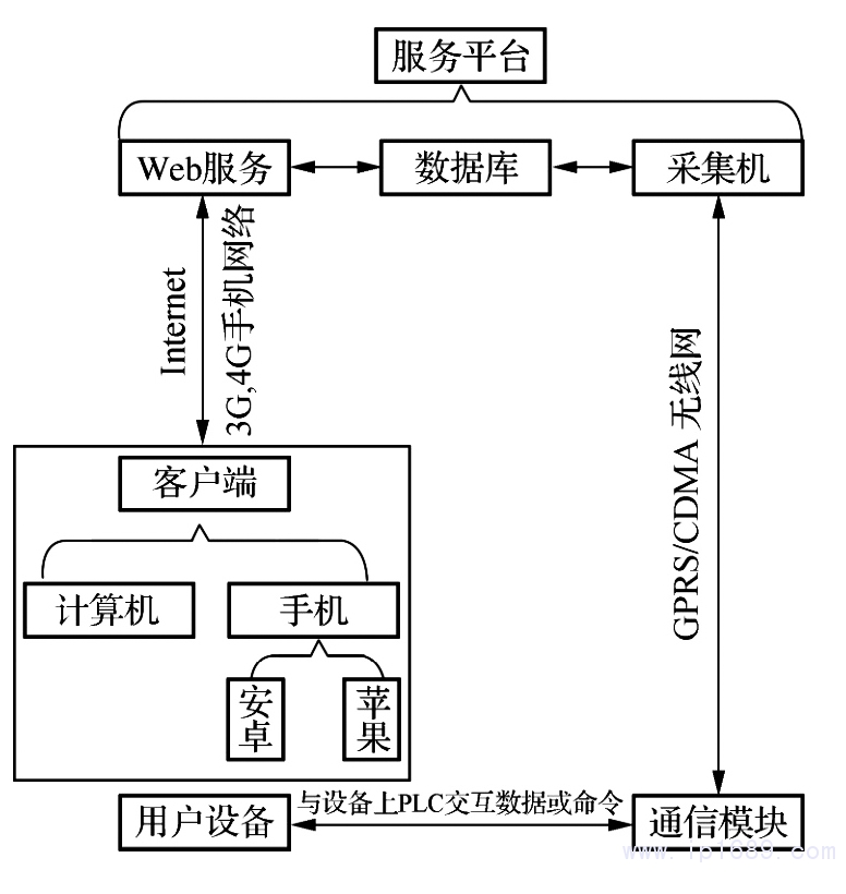 服務平臺由3部分構成,分別為 WeB服務、數據庫、采集機.WeB服務提供包括 GIS設備導航、設備建模與在線增刪、動畫演示、短信報警等在內的多種功能[2],可通過 GPRS/CDMA,InTeRneT,3G/4G手機網絡[3]實現分布于不同地方的設備、計算機系統、手機以及廠家、用戶等之間的信息交互,達到監測和控制設備的目的.通信模塊采用 ARM 芯片作為主控制芯片,該模塊從橡塑機設備上的PLC獲取溫度和設備運行狀態等數據[4],然后再通過 GPRS傳送到服務平臺,由服務器程序的采集機模塊負責接收并保存到服務平臺數據庫[5].客戶端包括電腦客戶端和手機客戶端,手機客戶端程序同時支持主流的 AndRoId系統和IOS系統。