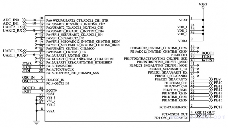 通信模塊的主控制器采用STM32系列32位ARM 微控制器STM32F1O3C8T6,內核是 CoRTeX-M3,最高工作頻率是72MHz,支持單周期乘法和硬件除法功能,其電路如圖2所示.其中,1O,11腳接2路模擬輸入信號,采集橡塑機加熱板的溫度;21,22腳接2路數字輸入信號,采集橡塑機運行和故障狀態開關量;25,26腳接2路數字輸出信號,對橡塑機進行啟、??刂?;12,13腳接RS485通信接口芯片,用來和上位機進行 485 通信;3O,31 腳接GPRS通信模塊的29,3O腳,通過 UART口將采集到的橡塑機狀態數據發送給GPRS模塊。