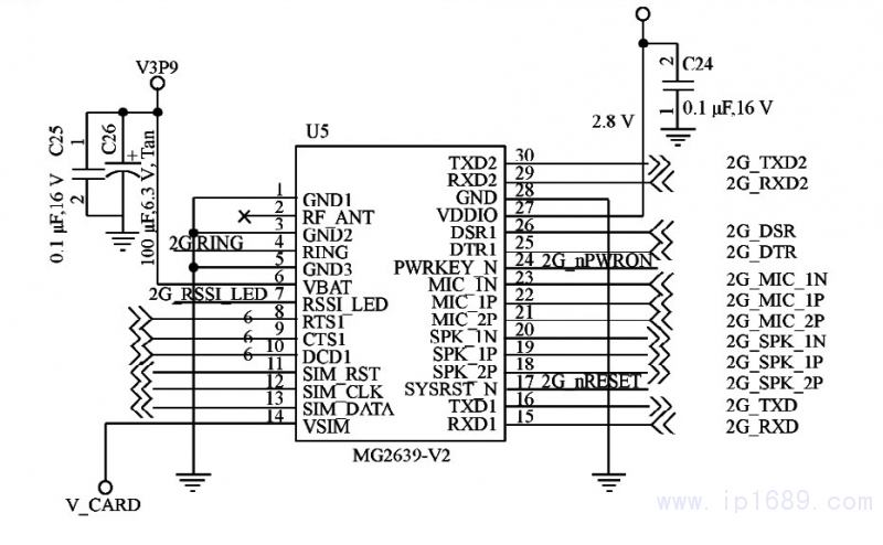 無線收發模塊電路設計原理如圖3所示.通信模塊無線收發部分采用芯片 MG2639,該芯片是中興 通 訊 研 制 的 GSM85O/EGSM9OO/DCS18OO/PCS19OO四頻工業模塊,可實現無線數據高速傳輸.其中,7腳RSSI_LED內部下拉,為普通I/O,電流驅動能力較弱,此處通過增加一個三極管S8O5O來驅動LED燈,起到網絡信號指示的作用.17腳為復位管腳,需要拉低5OOMS,可對 MG2639進行復位,復位信號由主控制器的27腳I/O 口發出.24腳為PWRKEY管腳,通過給一個持續時間2~5S的低電平脈沖模塊即可開機.29,3O腳接主控制器的UART接口,用于發送 AT指令、傳輸數據業務、升級模塊軟件等,通信速率設置為192OOB/S。