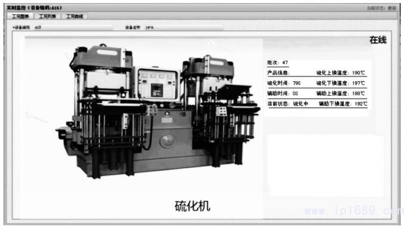 圖12所示為硫化橡塑機的工況測試信息界面.該界面可通過圖表、列表和工礦曲線的形式實時顯示每臺硫化橡塑機的工礦信息,工況信息包括硫化時間、輔助時間以及硫化上、下模溫度等指標.通過這些數據,管理人員可實時監控生產過程中的硫化機溫度,降低工人因為人為失誤或懈怠出現的殘次品概率,嚴格把控硫化產品質量。