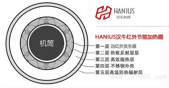 紅外加熱圈(結構圖見圖三)目前市面上也有叫納米紅外電熱圈、遠紅外節能加熱圈、紅外節能發熱圈等。紅外加熱圈通過紅外熱輻射方式,對塑料機械機筒(炮筒)進行紅外加熱,從根本上改變了之前普通加熱圈接觸式熱傳導方式;發熱元件采用了高性能電熱絲實現電熱轉換效率99.8%以上,普通加熱圈的電熱轉換效率在60%左右,同時具有更長使用壽命,理論壽命長達12000個小時;紅外加熱圈內部采用航天級保溫隔熱材料氣凝膠作為隔熱層,減少溫度對外發散,提高電熱利用率,紅外加熱圈表面溫度最低可達到35℃,綜合以上三個方面從根本上改變了普通加熱圈電熱轉換效率低、傳熱效率低、表面溫度高的“兩低一高”致命缺點,實現了塑機加熱圈部分的節能。注:以上描述摘抄自漢牛科技。