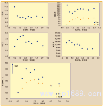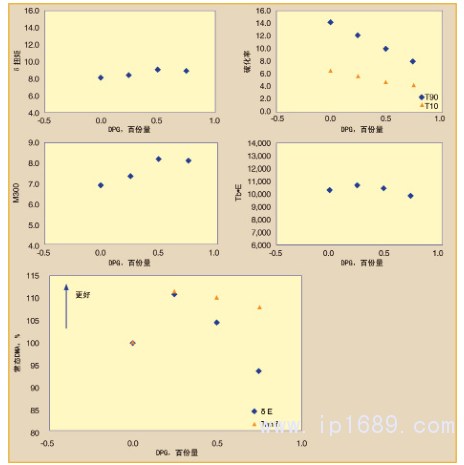 隨著DPG的增加,對焦燒安全性(T10)和佩恩效應(δE′)有負面影響(圖3)。Tanδ(RR)也有類似的趨勢。重要的是要注意到,有來自歐盟REACH法規淘汰此產品的使用的壓力。