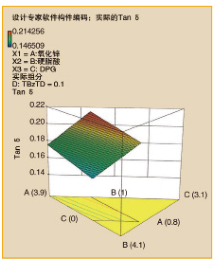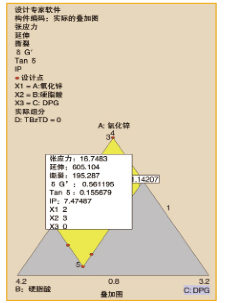 假設我們在沒有任何其它性能評判的情況下解決了Tan δ的最大化好處,那么我們就有了圖5所示的結果。原料含量為氧化鋅2份,硬脂酸3份,DPG 0份。用0.865的可靠性因子預測,可以很容易地通過快速復合混合來驗證該解決方案。