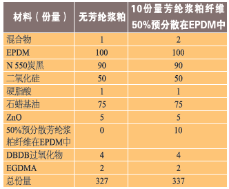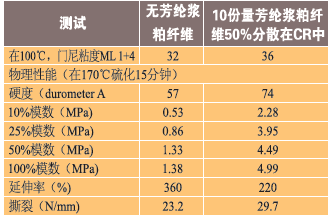 芳綸作為極性材料,將與極性彈性體進行最佳的互動。然而,彈性粘結劑中的預分散芳綸纖維可以很好地分散這些纖維在極性或非極性彈性體中,如表2~表5所示。表2顯示了一種基于氯丁橡膠的橡膠復合配方,一種極性彈性體,具有無預分散芳綸纖維。如表3所示,隨著芳綸纖維的加入,物理性能,包括抗撕裂性得到了改善。