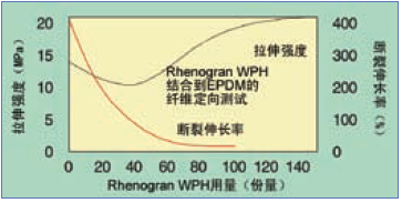 為了生產Rhenogran WP,木漿被粉碎,然后結合各種彈性體;對于某些產品,添加含間苯二酚-甲醛樹脂。為了最大限度地提高纖維對橡膠的附著力,建議在化合物中加入一個亞甲基供體。最終產品是一種提高了復合性能,降低了復合成本的易于分散的母粒。Rhenogran WP再分散作用令其在非極性和極性彈性體中均可分散良好,并在非極性彈性體,如三元乙丙橡膠中實現了最好的分散。木漿纖維添加到橡膠化合物的好處如圖7和8所示。圖7顯示了增加木漿纖維量其抗拉強度顯著增加,伸長率明顯降低。采用ASTM die C方法測量,即使在低負荷下木漿纖維也改善了抗扯強度(圖8)。