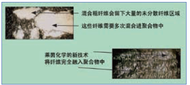 相對于其它短纖維類型,芳綸纖維具有更高的韌性和不滲透性。此外,由于其韌性高,當它們被切碎,這意味著芳綸纖維的“有原纖維組織的”兩端擴散成細纖維,將使其表面積急劇增加。機械手段可以用來進一步增加這種纖維細化。這種現象,連同其極高的長徑比,可提供已添加這些纖維的橡膠化合物非常高強度的性能。反過來,這些相同的特性又會抑制原料纖維的充分分散。為了克服這一問題,在彈性體粘合劑中預分散芳綸纖維是必不可少的。圖10顯示了通過朗盛公司的專有方法預分散的芳綸纖維與不充分分散的原絲芳綸纖維的對比結果。
